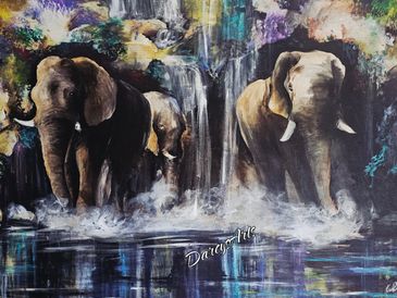 Paintings on display is 'Elephants bathing' Acrylics on canvas.